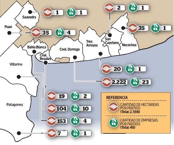A la actividad olivícola del país, se ha incorporado, desde fines de la década de 1990, el Sudoeste de la Provincia de Buenos Aires (SOB). El aceite de oliva (AO) de esta Región —semi-árida, con un clima frío y cercana al mar— contiene un alto grado de ácido oleico por lo que presenta ventajas comparativas respecto al proveniente de otras zonas del país. Entre diciembre de 2015 y enero de 2016, se han censado 48 explotaciones, totalizando 2.598 ha de olivos implantados. La variedad de aceituna por excelencia es la arbequina, pequeña, con carozo grande y poca pulpa. En la actualidad, la producción supera el millón de litros al año, la mayor parte destinada al mercado interno.