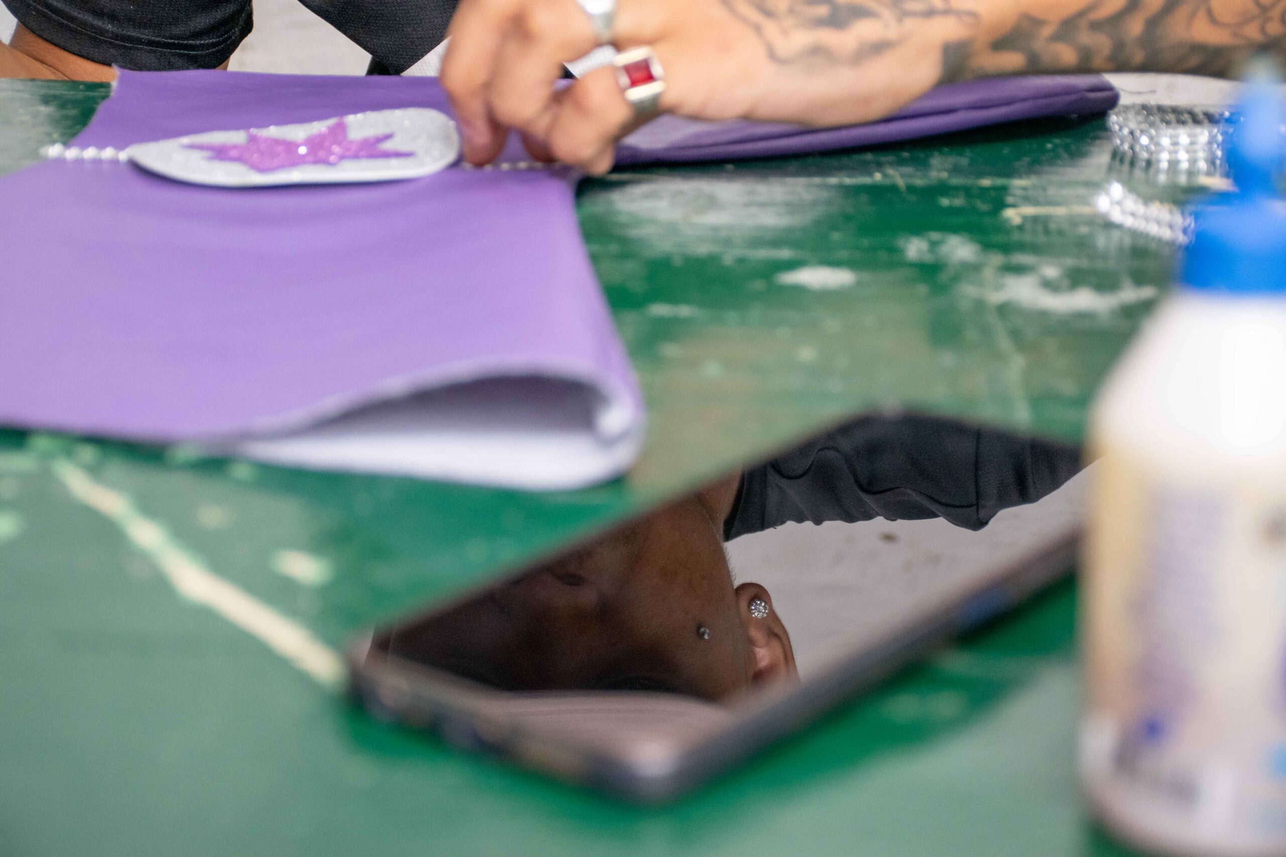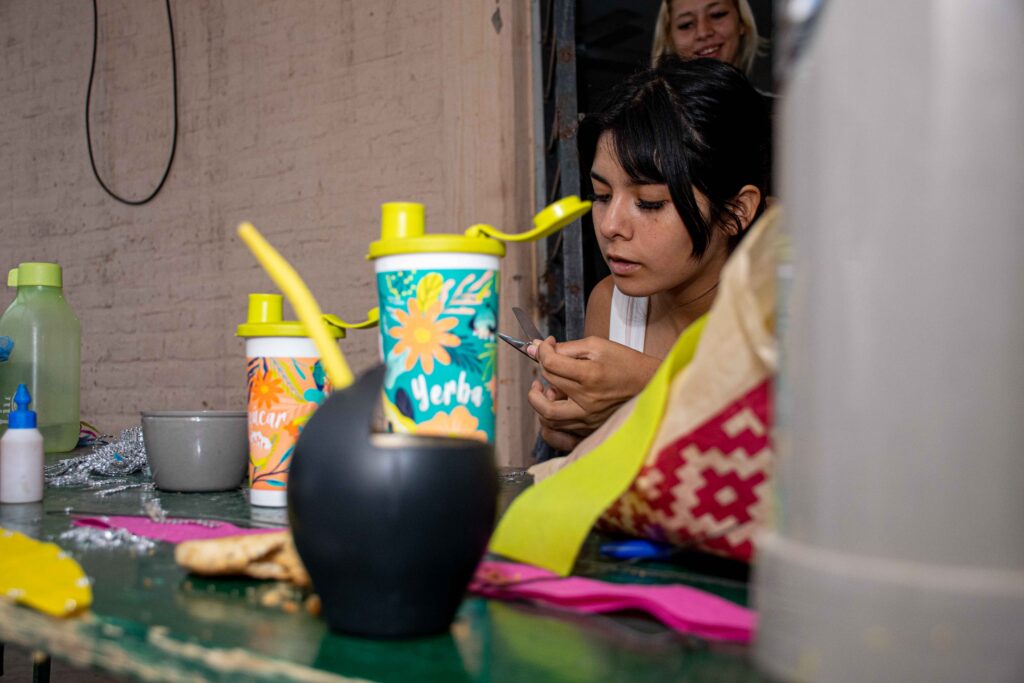 La que abre el fuego con Revista La U es la bailarina Yamila Carbajal (20), que casi no levanta la mirada de las mangas violetas que arma con el pegamento diluido en botellas de Coca Cola o agua saborizada chica. La rawsina dice que el objetivo del caluroso viernes de febrero es terminar más de 50 mangas para los trajes y cuenta que trabajarán, como en cada jornada, hasta por lo menos las tres de la mañana. También hacen botas con tela para cubrir el calzado de los danzantes.