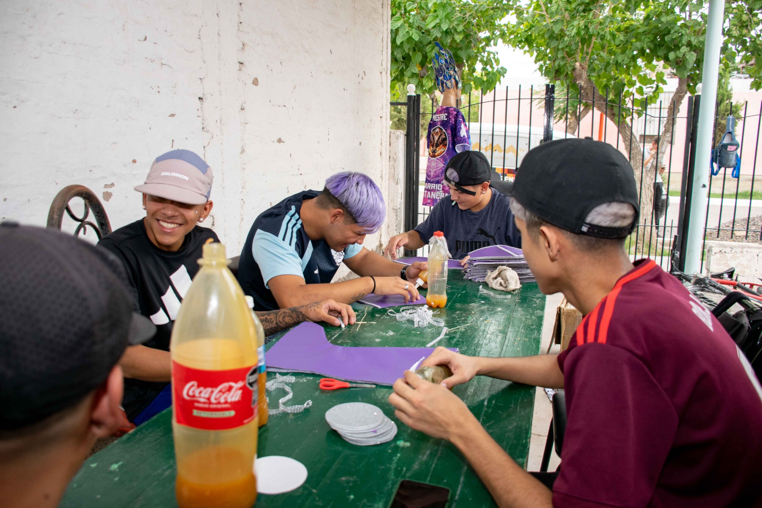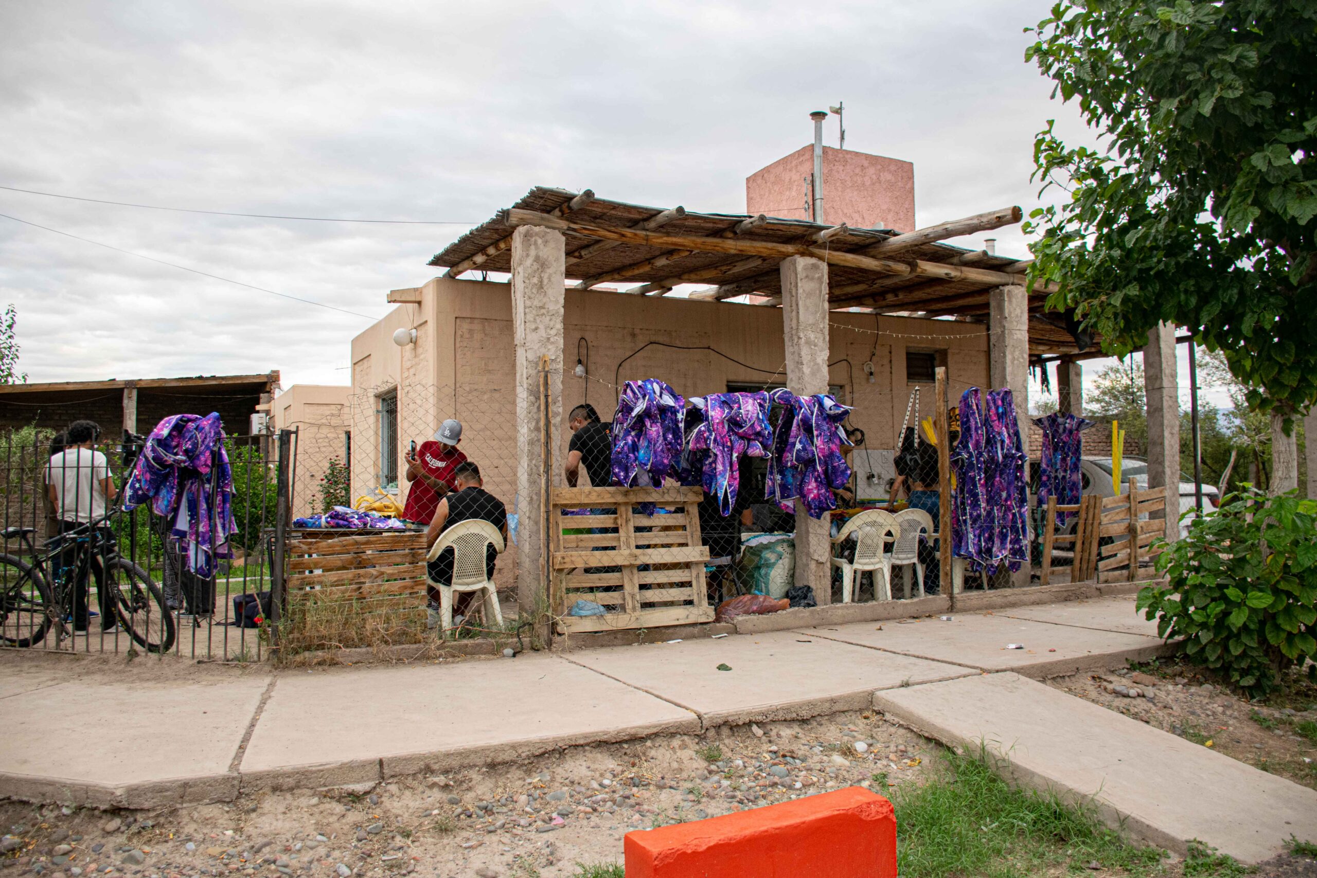 “Acá se terminan los trajes”, dice uno de los hombres que trabaja sobre una de las tres mesas que están a un costado de una casa esquina del barrio La Estancia, un núcleo habitacional construido hace poco más de una década. Allí funciona el tercer taller de la comparsa, en donde al material que envía Laura le colocan las capuchas, las hombreras y hasta las plumas. Un grupo silencioso que se desempeña entre mates, termos, semitas y telas lilas y azules para “representar la galaxia” durante los corsos.