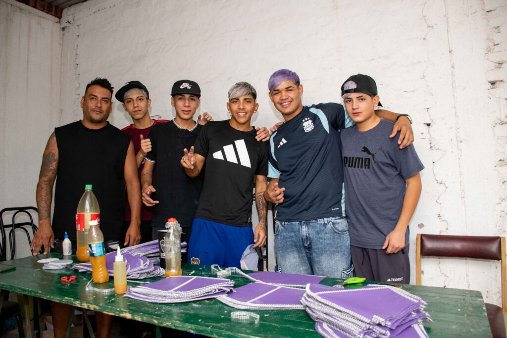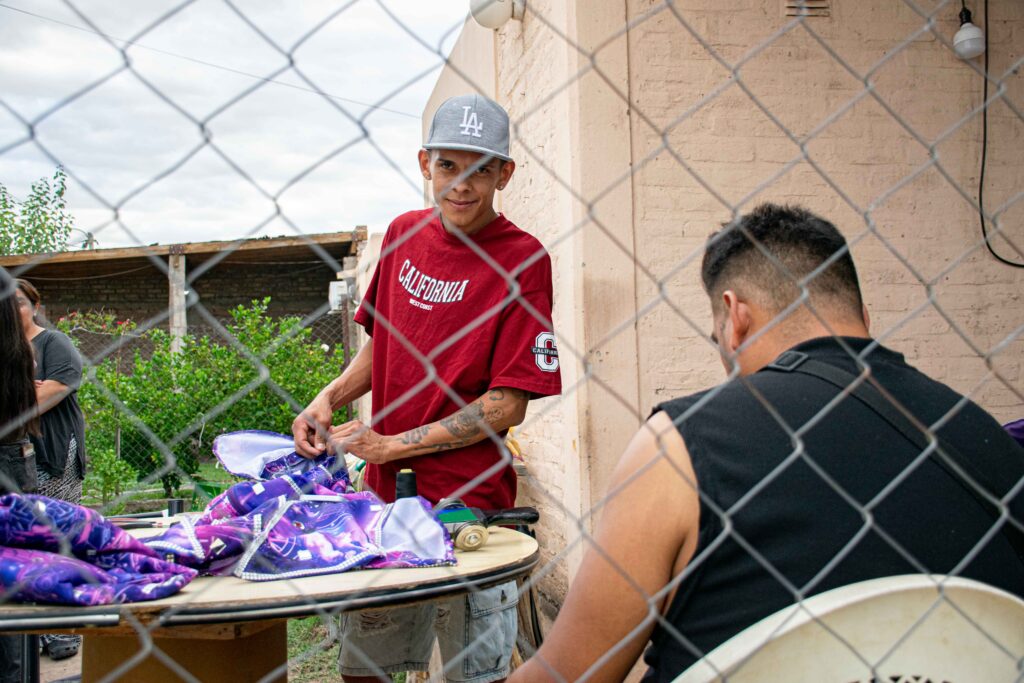 Uriel Escalante (17) luce el pelo teñido del mismo color que las mangas que construye. Además de la bermuda de jean tiene una remera de la Selección Argentina con las tres estrellas mundialistas arriba del escudo. En su cabeza quizás circule, justamente, el anhelo de representar al país como boxeador. Es sobrino del conocido pugilista Bernardo “Fito” Fernández y su sueño es llegar al Luna Park, el gran escenario del boxeo argentino.