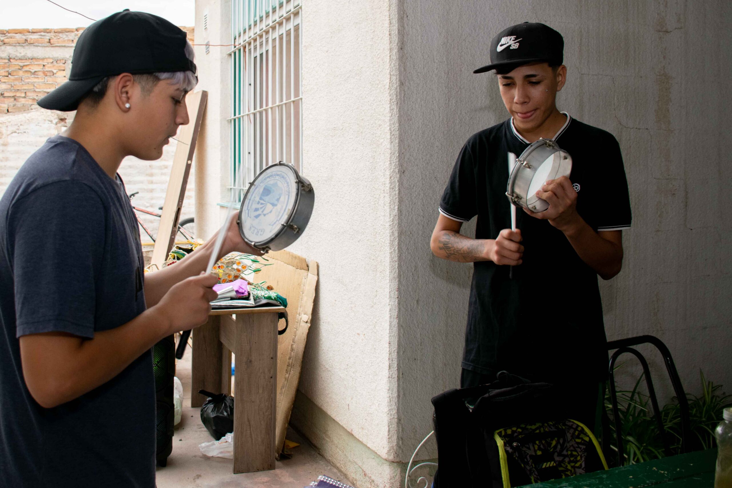 Ezequiel Cepeda ya tiene los 18, también vive en el Parque Industrial y termina la secundaria en la escuela Isabel Gironés. Otro que se suma un poco más tarde al grupo es Tomás Guzmán (14), cuyo interés está puesto en la escuela y en el fútbol. Él se jacta de ser primo del integrante más chico de la batería: Simón, quien tiene 6 años y toca la caixa. Entonces saca su celular y muestra un video para certificar, orgulloso, el tempranero talento del niño.