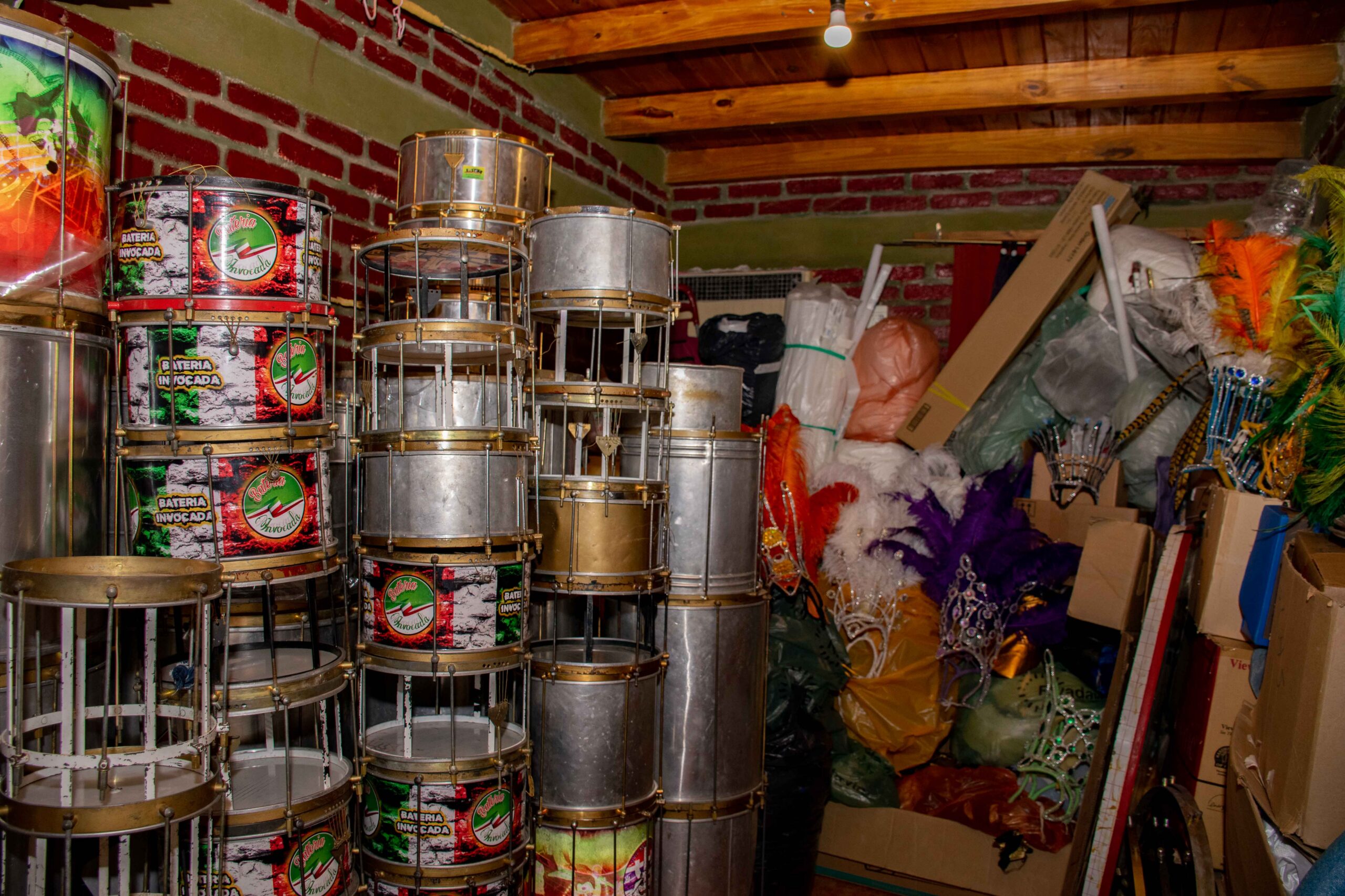 En ese espacio hay desde agogós (para los niños de 10 años), caixas (parecidas a los redoblantes, pero con dos cuerdas arriba) y frigideiras, hasta cuicas y chocalhos (lo tocan las mujeres que van adelante en la batería).