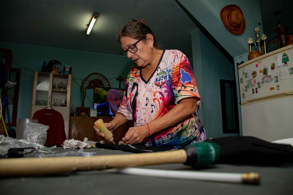 La jornada de Laura empieza a las siete de la mañana, solo hace una pausa para dormir la siesta y termina su trabajo en la noche. Gran parte de su vida estuvo atravesada por el carnaval y sus rituales. En el living de la casa acomoda cuidadosamente la indumentaria y recuerda que en la festividad chimbera ya no hay reina, sino que eligen a la musa y a la mejor pasista, que es como una reina de la batería.