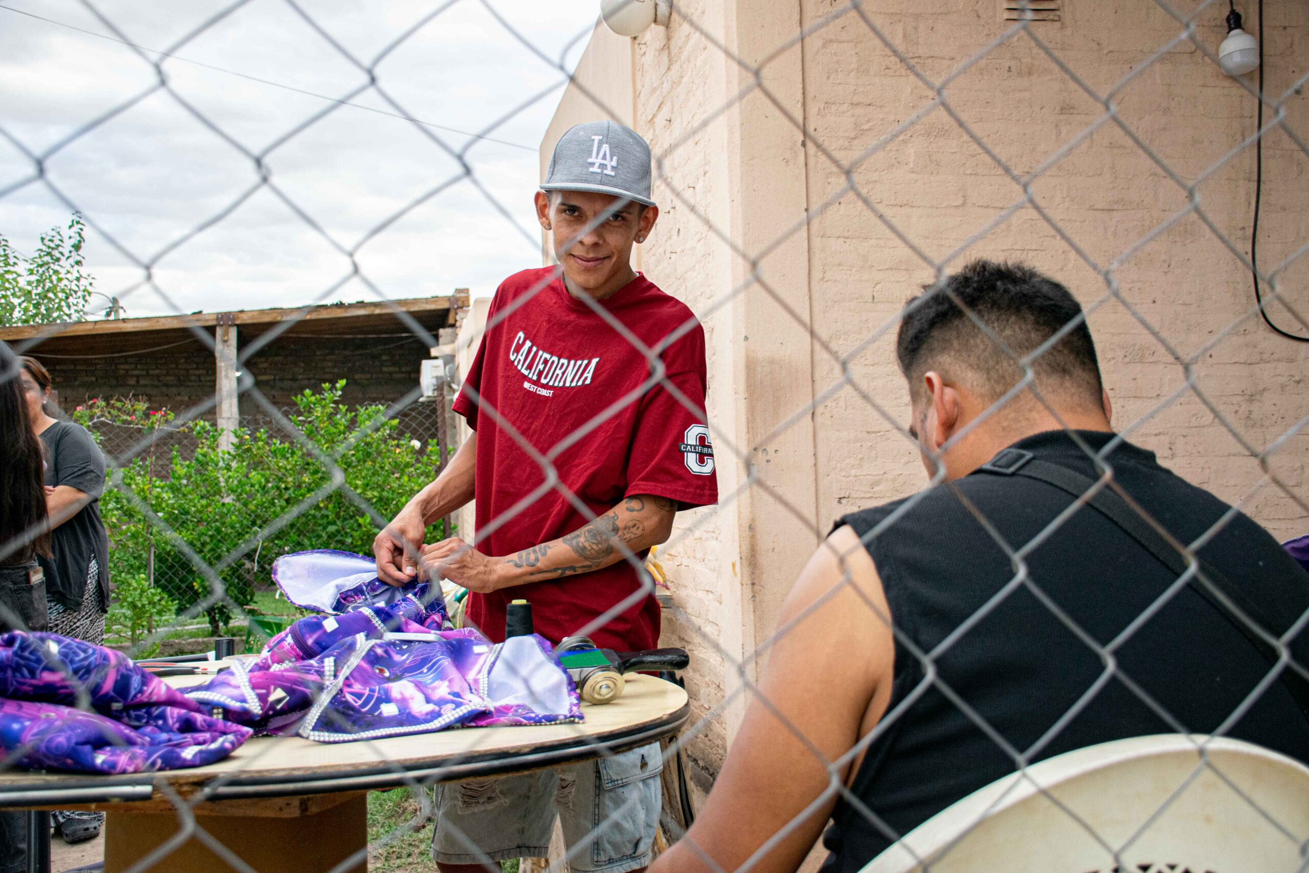 Kevin Báez se atribuye las cerca de 100 mangas que hicieron durante los últimos días y sus compañeros lo desmienten mientras explotan de risa. Inmediatamente, el tatuador de 17 años que viste un short de Boca pide el apoyo de sus pares para que le crean que se hizo él solo un tatuaje en todo el antebrazo izquierdo. Vive en calle 25 de Mayo y Cipolletti y llega a esa sede de producción (de las tres que tiene la comparsa) después de trabajar en un local que comparte con un amigo peluquero.